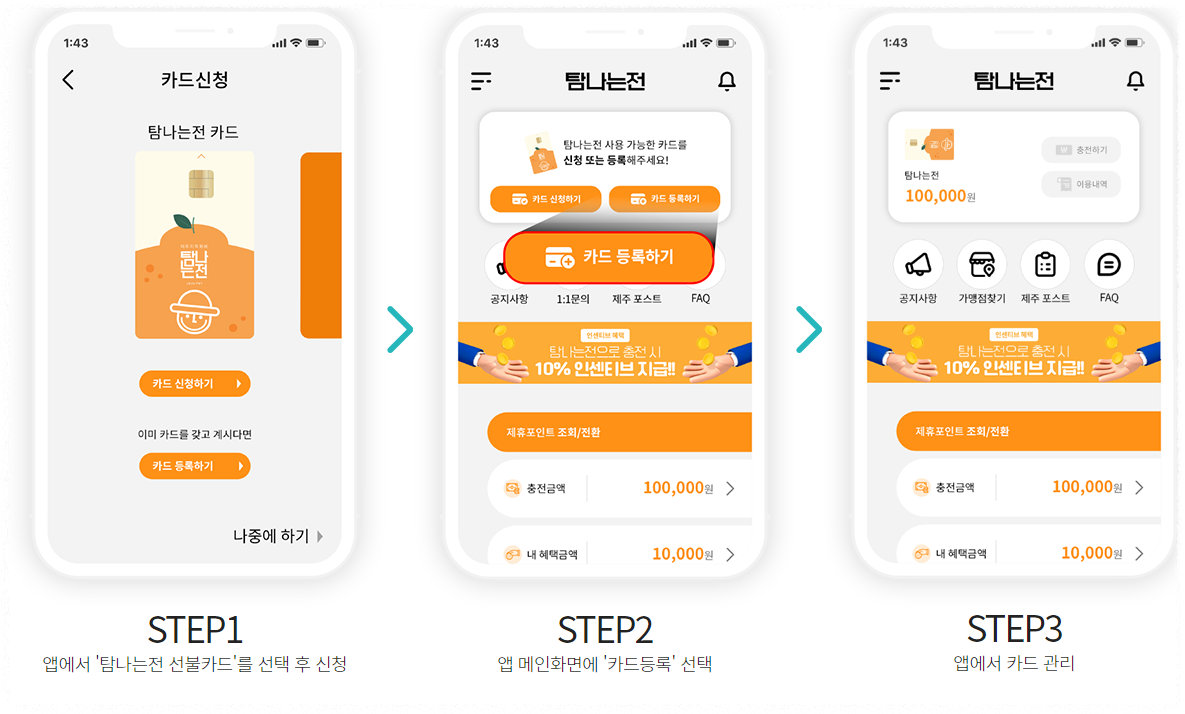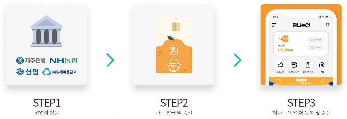1) 카드형 온라인신청 : 탐나는전 앱을 이용하여 발급받습니다.